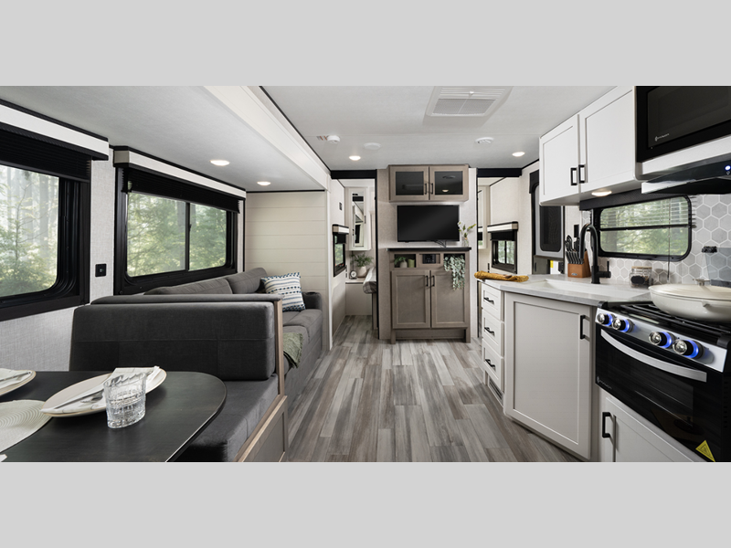 Sleeps 4 Slides 1 Length 31 ft 1 in Ext Width 8 ft Ext Height 11 ft 2 in Int Height 6 ft 9 in Interior Color Classic Farmhouse Hitch Weight 825 lbs GVWR 7995 lbs Dry Weight 6310 lbs Cargo Capacity 1685 lbs Fresh Water Capacity 52 gals Grey Water Capacity 39 gals Black Water Capacity 39 gals Tire Size ST205/75R14D Furnace BTU 25000 btu Available Beds Queen Refrigerator Type 12V Refrigerator Size 11 cu ft Cooktop Burners 3 Number of Awnings 1 LP Tank Capacity 20 lbs Water Heater Type Tankless AC BTU 13500 btu Awning Info 18' Power with LED Lights Axle Count 2 Number of LP Tanks 2 Shower Type Radius Electrical Service 30 amp Similar Floorplans